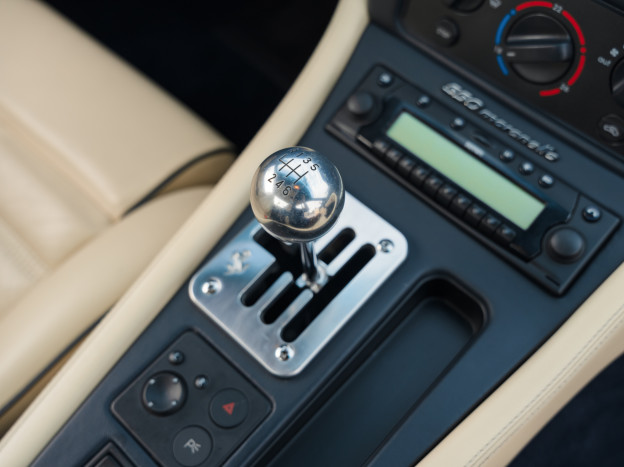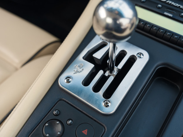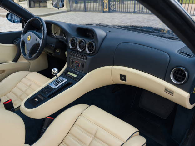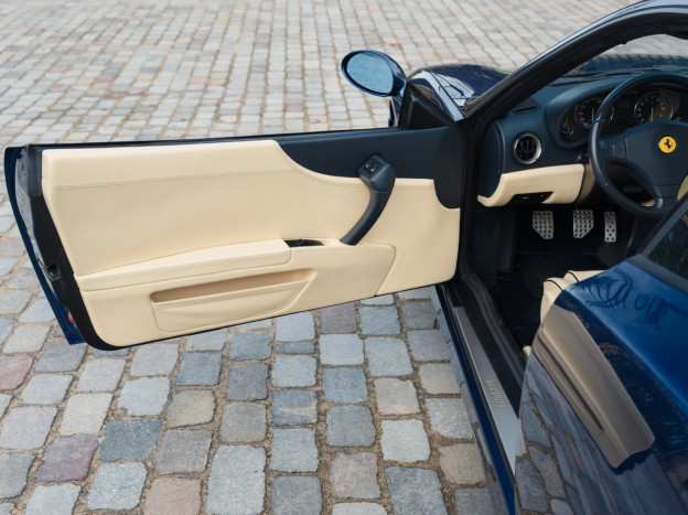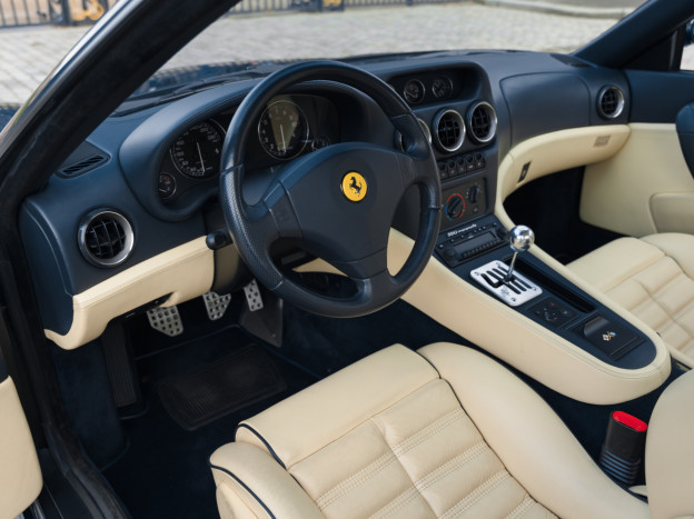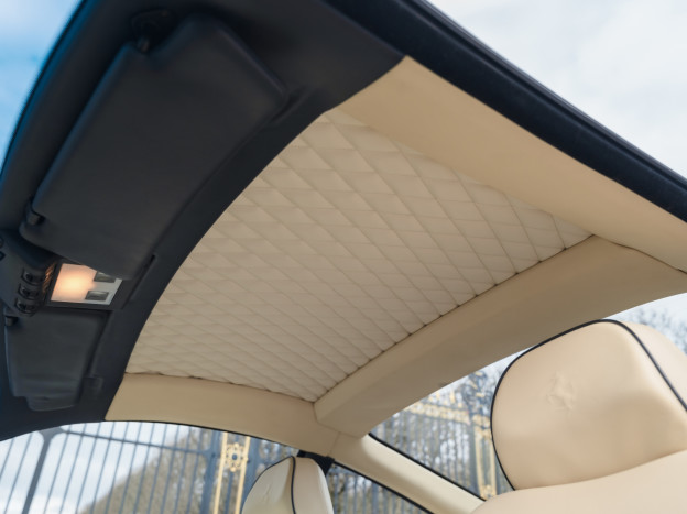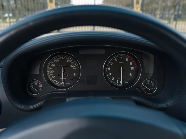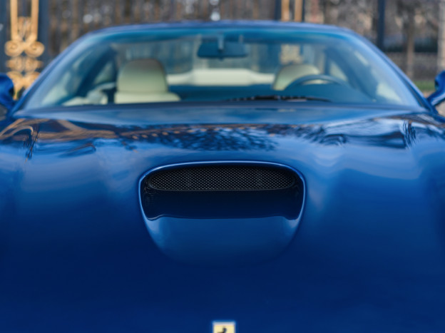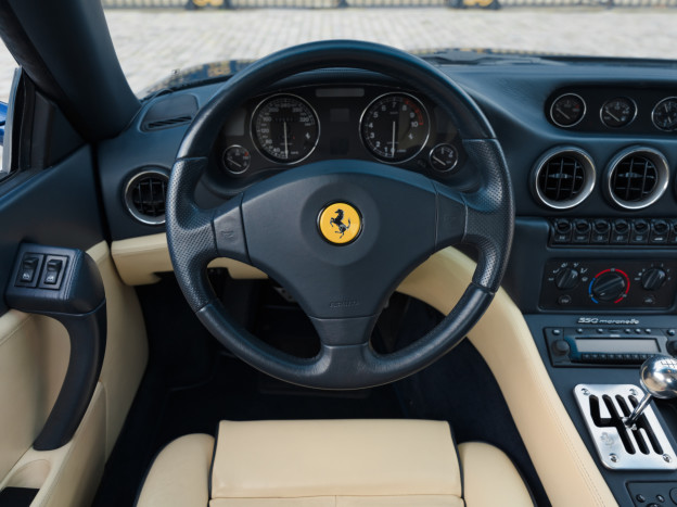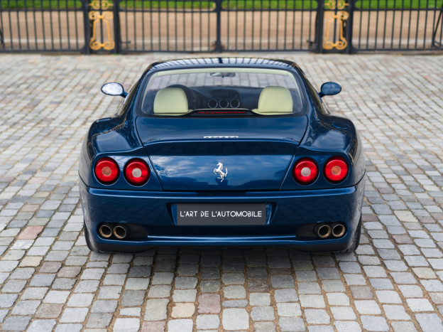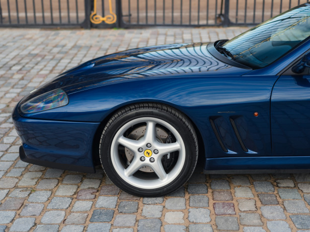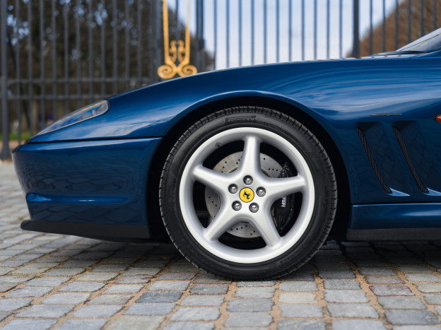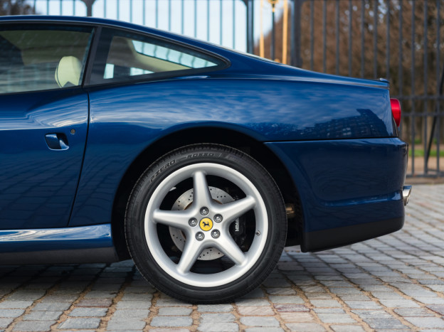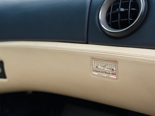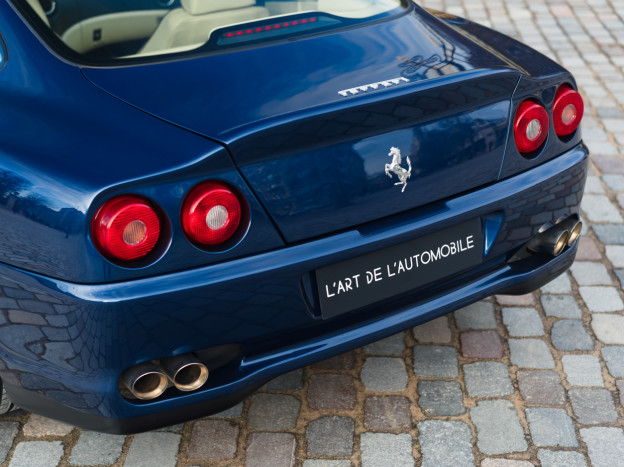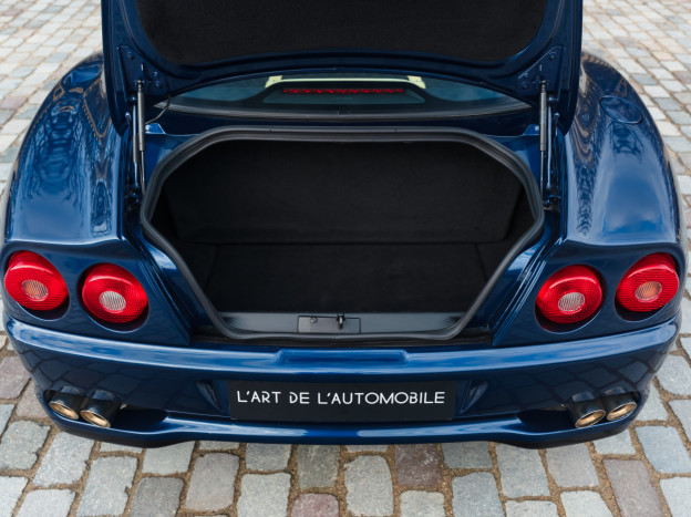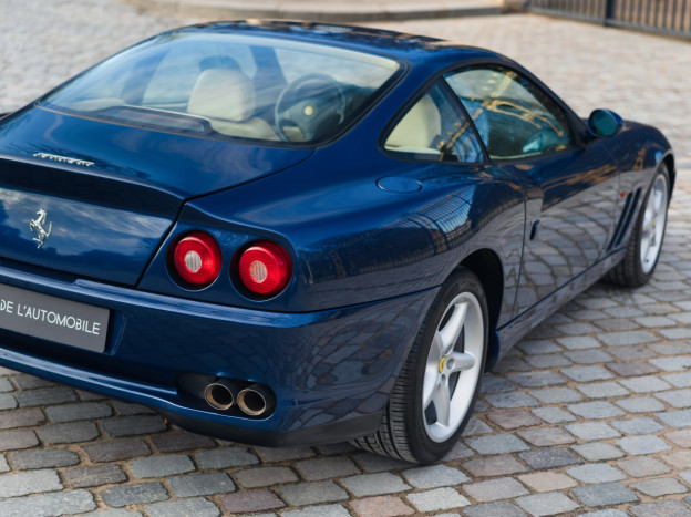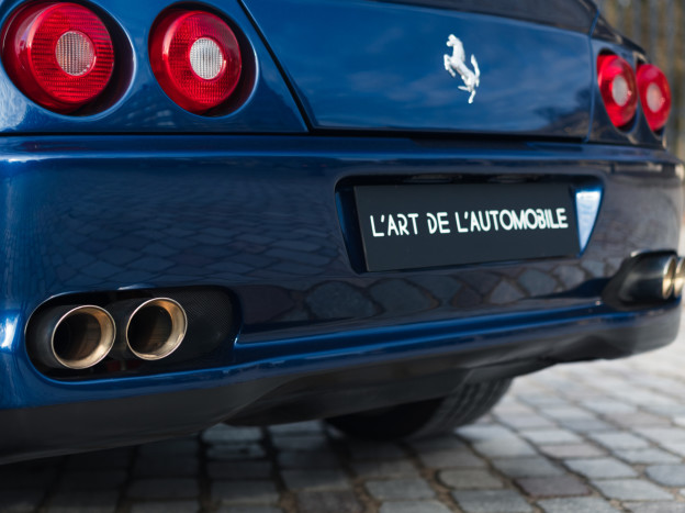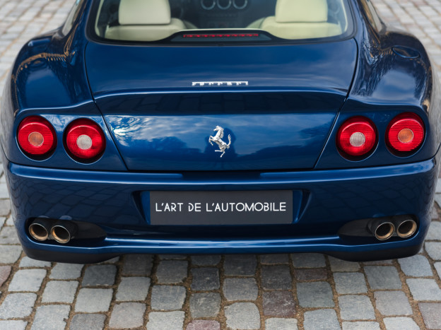 La superbe Ferrari 550 Maranello que nous proposons à la vente est un exemplaire qui dispose d'une très belle et rare configuration Blu Tour de France, avec l’intérieur en cuir Crema et Blu Scuro, avec le matelassage du ciel de toit et de la belle plage arrière, mais aussi les passepoils en Blu Scuro. Dans un état exceptionnel, cette auto a parcouru moins de 26 000 kms ! La voiture est par ailleurs équipée d'un échappement Tubi Style à la sonorité incroyable.