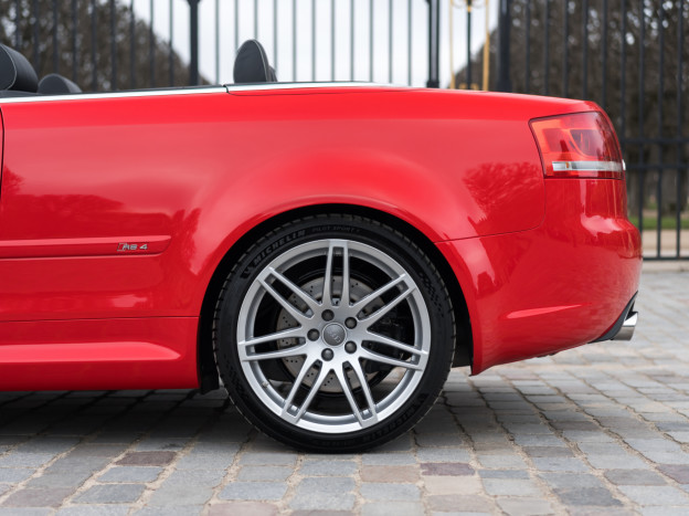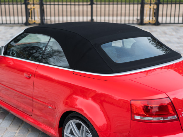 We are offering for sale a coveted model, the Audi RS4 B7 in its rare Cabriolet version. This car features the beautiful pearlescent Misano Red color, paired with a black leather interior. This RS4 is still entirely in its first paint! It has covered 133,800 kms, has been regularly maintained, and is presented in excellent overall condition. Its service is up-to-date and the car is very well equipped with heated seats, BOSE sound system, carbon decorative inserts, parking sensors, leather Sport seats, ...