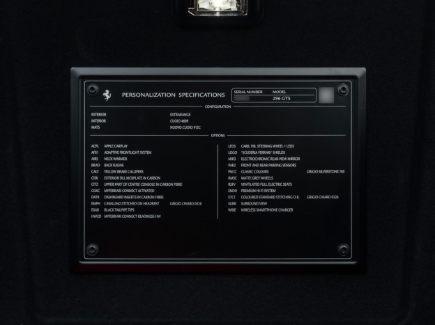 The Ferrari 296 GTS we are offering for sale has only 3,200 km on the odometer! This Ferrari boasts an elegant and sophisticated configuration. Painted in the elegant Grigio Silverstone color, with matte grey wheels, Scuderia shields, yellow brake calipers, and black exhaust tips, the interior of this Ferrari features Cuoio leather with a steering wheel in carbon fiber as well as many other parts, fully electric ventilated seats, and Grigio Chiaro stitching. This car is ideally equipped for everyday use, including parking assistance with a panoramic view, Apple CarPlay, adaptive headlights, and a premium sound system.
