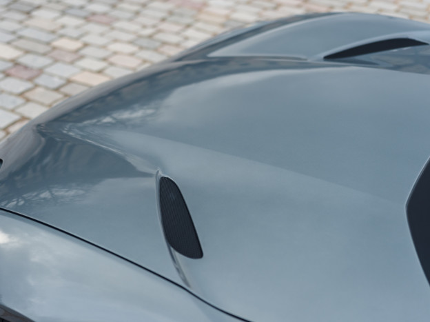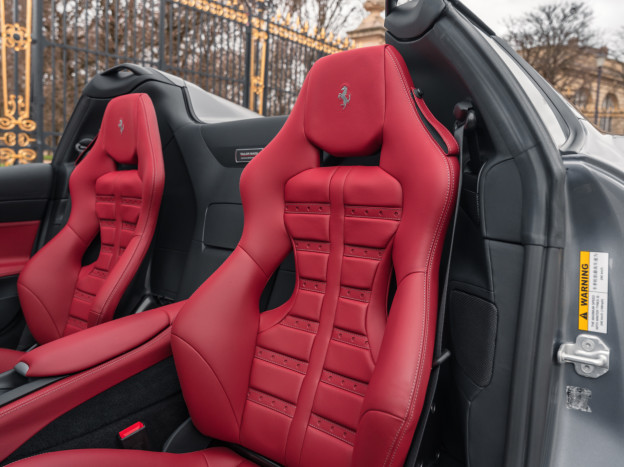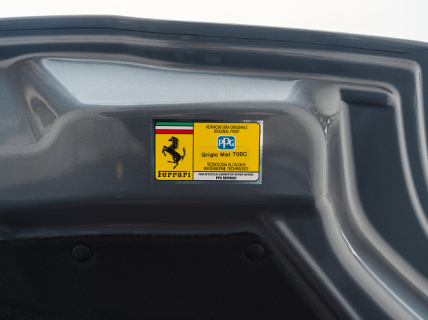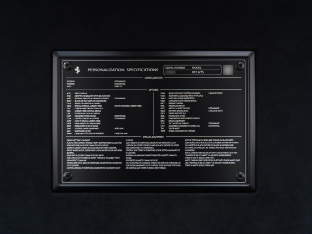Cette exceptionnelle 812 GTS rend hommage à une très belle Ferrari BB 512, le châssis #048657. L'extérieur de cette 812 GTS reprend la teinte d'époque Grigio Met 700C de cette BB 512, adoptant en plus une exceptionnelle livrée bi-ton transversale qui démarre du bas du bouclier avant pour s'étendre à l'intégralité du pare-choc arrière en Canna di Fucile. Tous les plastiques extérieurs ont été peints en Canna di Fucile pour un résultat splendide. Enfin, les jantes bénéficient de la finition Diamant, les centres de roues sont en Nero DS Opaco et les étriers sont en Aluminium. Le parti pris de ne pas ajouter les écussons d'aile contribue à rendre cette auto intemporelle.