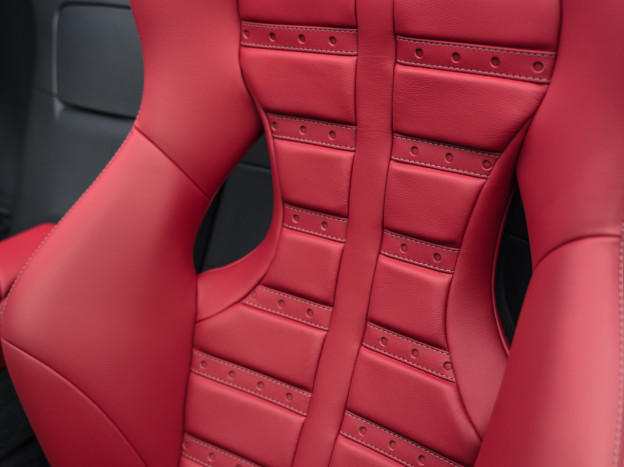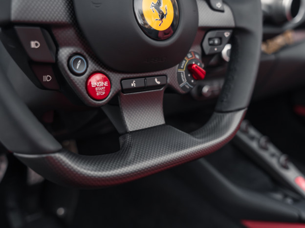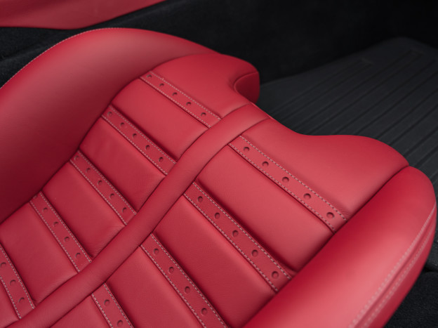Inside, the upholstery chosen to pay tribute to this BB 512 is the incredible Rosso Amaranto CS 97 grained leather, a color borrowed from the world of furniture, with other interior elements finished in black leather. The custom-made floor mats, designed to replicate the style of those in the Berlinetta Boxer, are a sublime touch. A sign of extreme personalization, all the interior carbon fiber is matte. The stitching colors were carefully chosen, resulting in Charcoal, Rosso, and Nero stitching depending on the component it adorns. Special Tailor Made door sills and a plaque in the cabin further enhance this vibrant tribute.