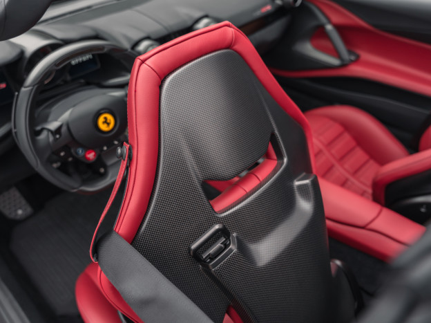 A l'intérieur, le revêtement choisi pour rappeler celui de la BB 512 est l'incroyable cuir grainé Rosso Amaranto CS 97, qui reprend une teinte issue de l'univers du mobilier, avec d'autres éléments de l'intérieur en cuir Noir. On remarque ensuite les tapis sur mesure qui reprennent le design de ceux de la Berlinetta Boxer : sublime clin-d'oeil. Signe d'une personnalisation poussée à l'extrême, toute la fibre de carbone intérieure est matte. Les couleurs des coutures ont été le fruit d'une grande réflexion, ainsi l'on retrouve des coutures Charcoal, Rosso, Nero selon les pièces qu'elles subliment. Les seuils de porte Tailor Made spéciaux ainsi que la plaquette dans l'habitacle viennent renforcer cet hommage vibrant.