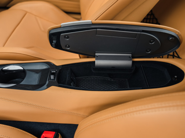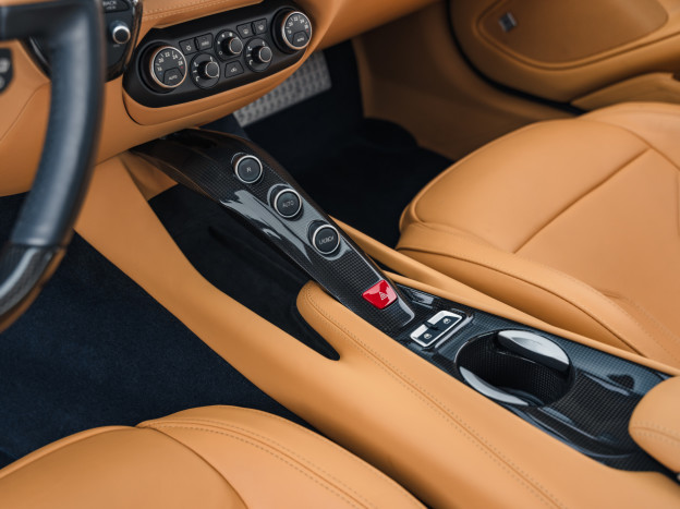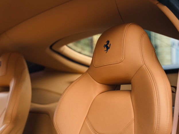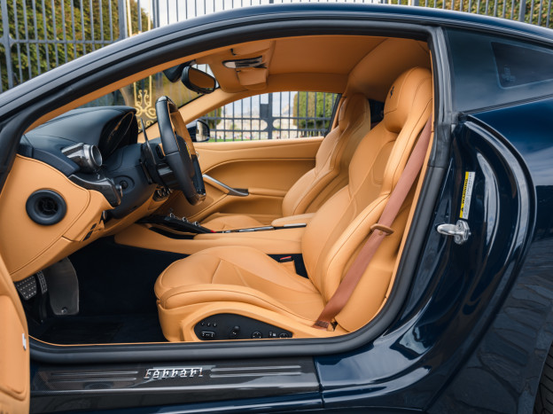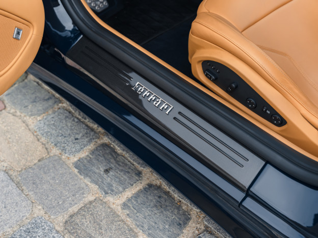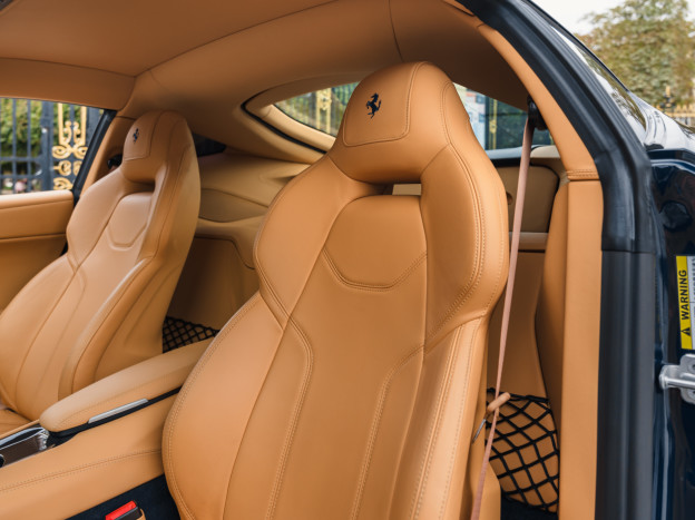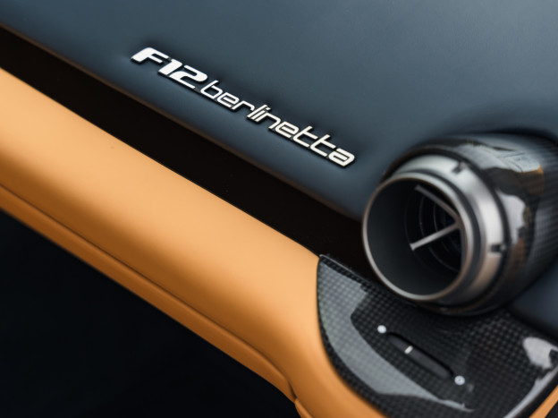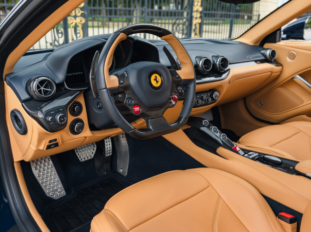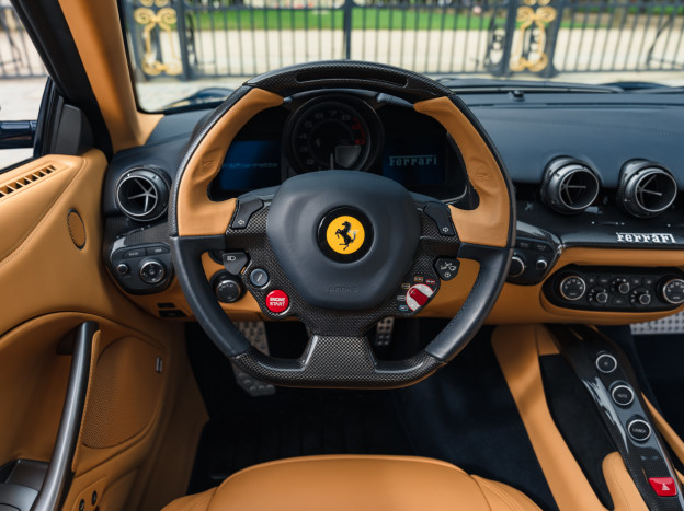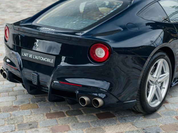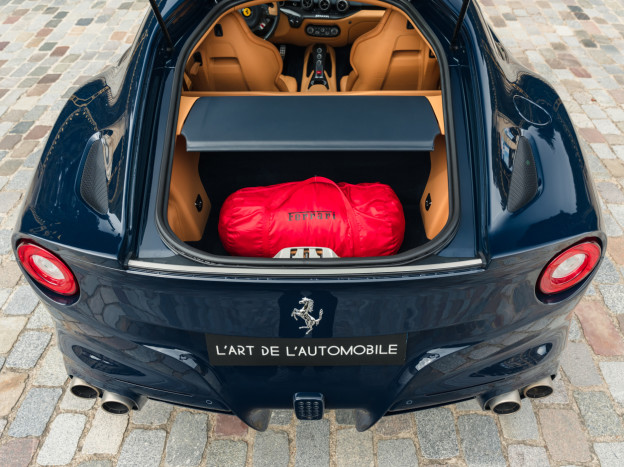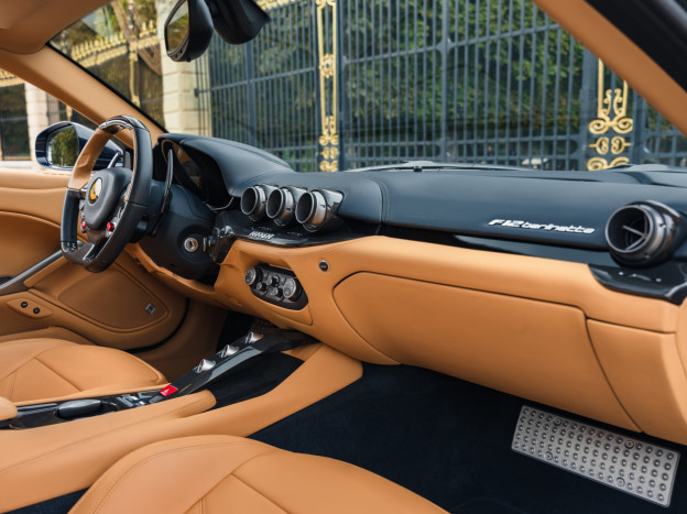 L'intérieur est également exceptionnel, personnalisé jusqu'à la plage arrière. Majoritairement en cuir Beige, on retrouve dans l'habitacle quelques fines touches de bleu et de carbone. L'auto est très bien équipée avec la HiFi JBL, le régulateur, les aides au stationnement, ... Dans un état exceptionnel, cette Ferrari F12 Berlinetta a été livrée à la concession Ferrari de Hengelo aux Pays-Bas, où elle a été exclusivement suivie. Désormais immatriculée en France, cette F12 a parcouru seulement 16 700 kms et elle sera à nouveau révisée pour la vente.