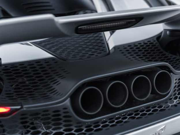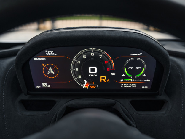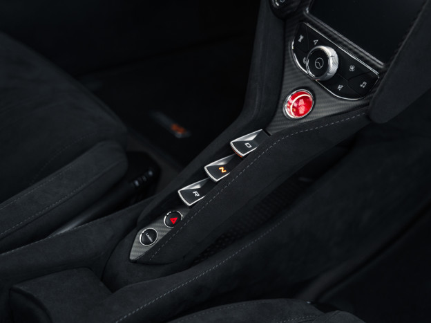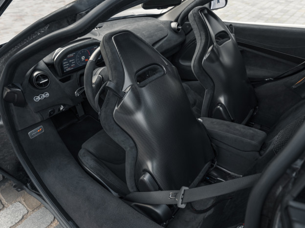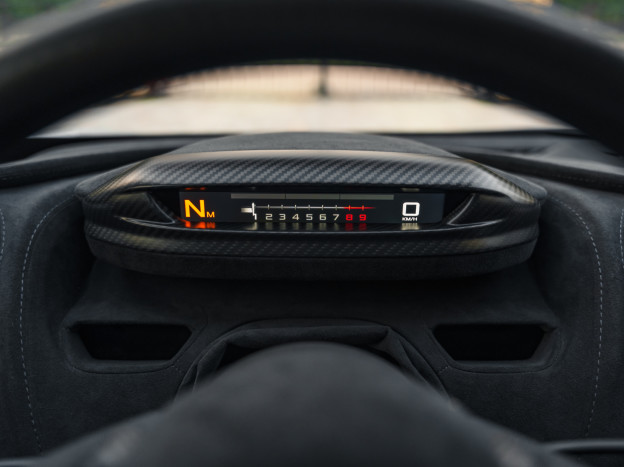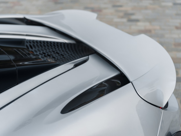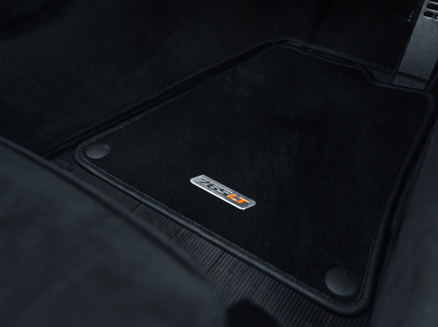 The 765LT Coupe is powered by a 4.0L twin-turbo V8 producing 765 hp and 800 Nm of torque, paired with a 7-speed dual-clutch transmission, for a dry weight of only 1,229 kg and a power-to-weight ratio of approximately 622 hp/ton. Performance is therefore exceptional: 0 to 60 mph in 2.7 seconds, 0 to 125 mph in 7.2 seconds, the standing 400 m in 9.9 seconds, with a top speed of 205 mph, and braking from 60 to 0 mph in 29.5 meters. This efficiency also relies on extensive weight-saving measures, including a titanium exhaust, numerous carbon components, and removed equipment. Its steering is razor-sharp and the turning radius has been significantly improved.
