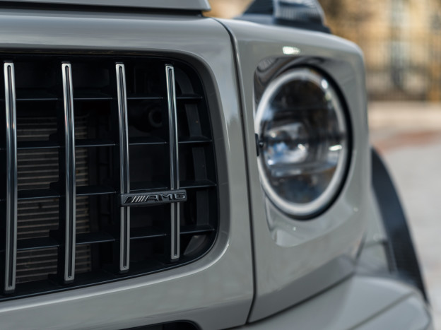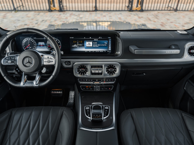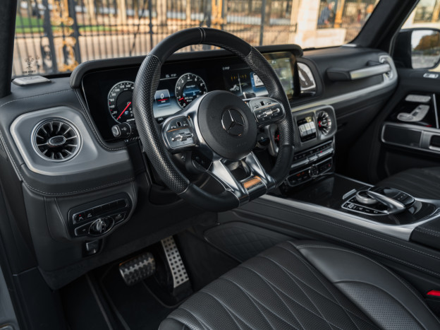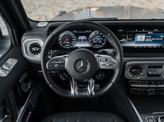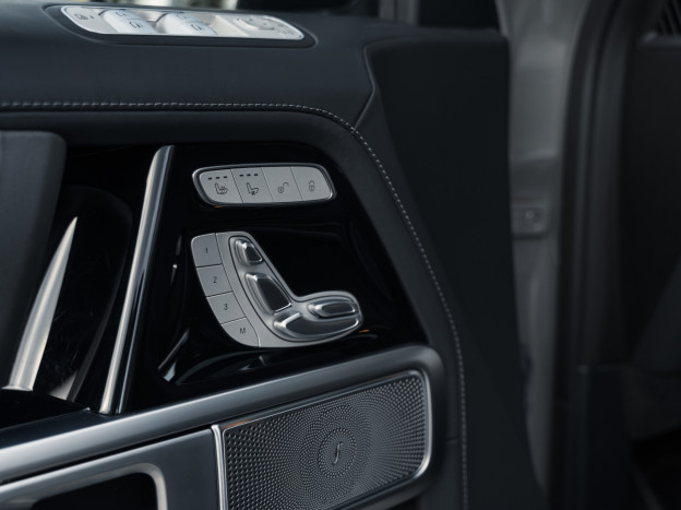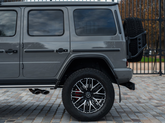 Of course, this G-Class benefits from the Burmester sound system, sunroof, and numerous driving and parking assistance systems. It is also equipped with the AMG Sport Black Pack and the AMG Sport Black Pack II, AMG carbon fiber trim inserts, and the Superior interior Line, which includes active multicontour seats Plus. The 4x4² package adds panoramic cameras, AMG carbon fiber engine cover, carbon fiber Professional spare wheel, mud flaps, digital rearview mirror, ...