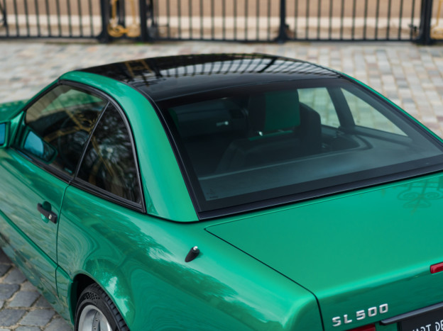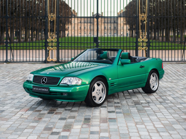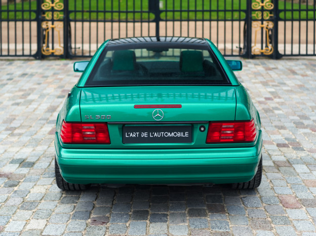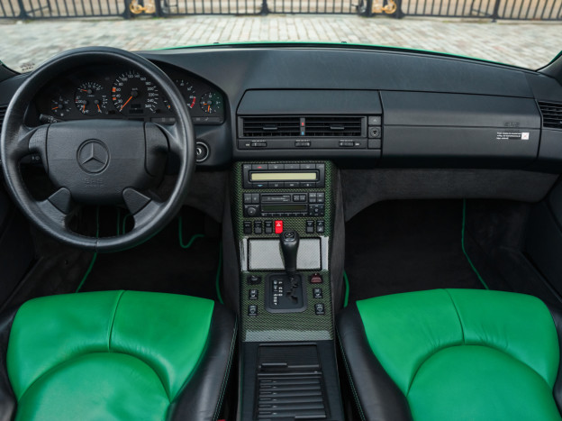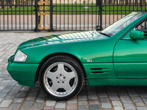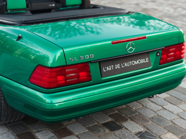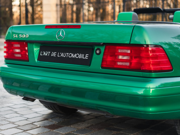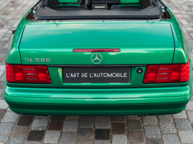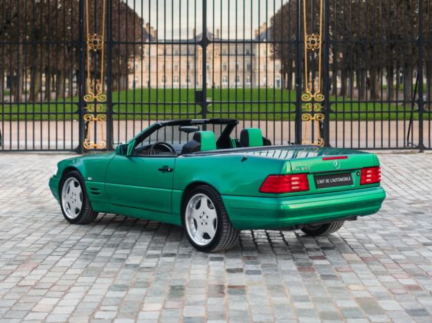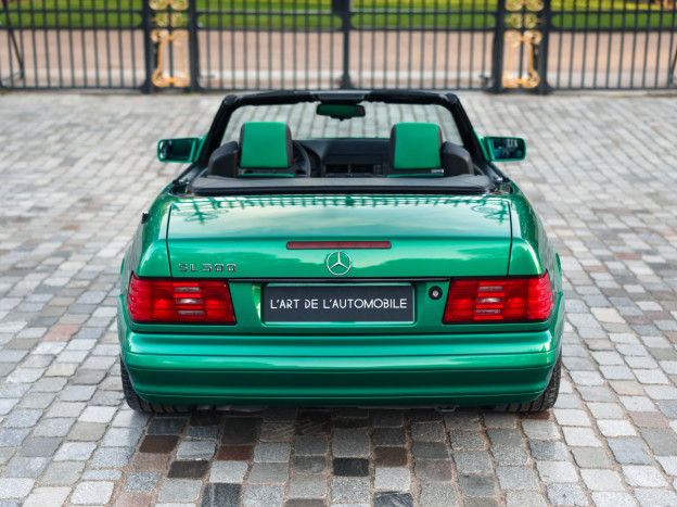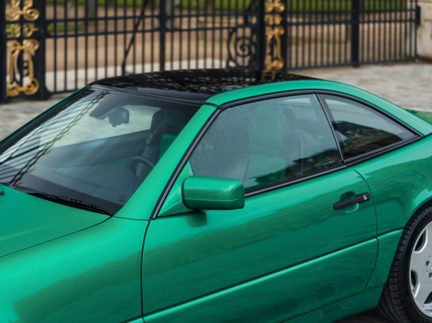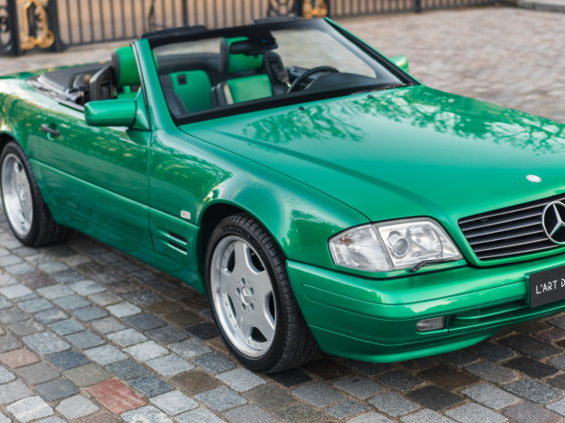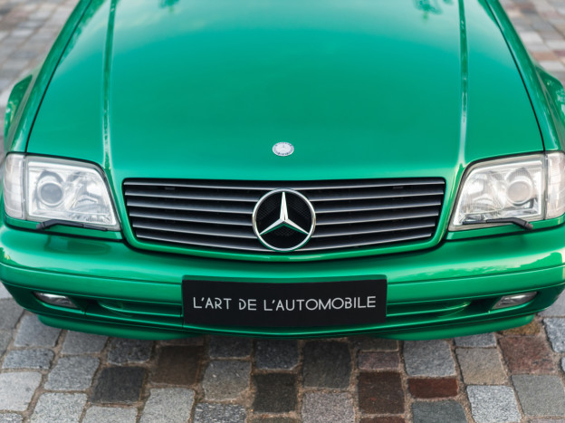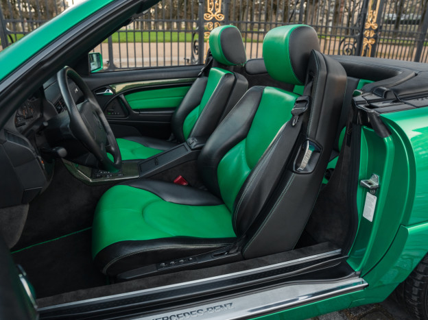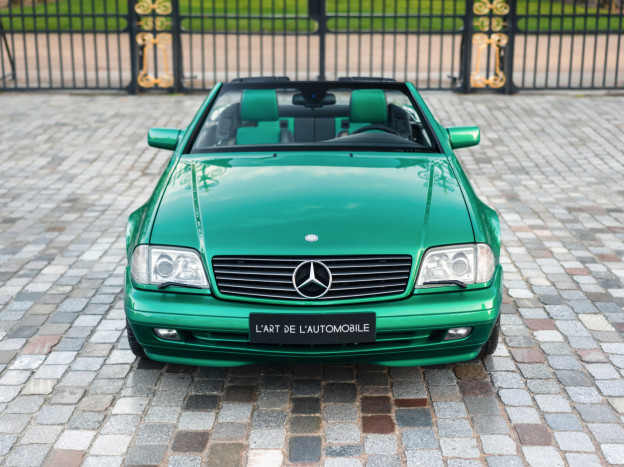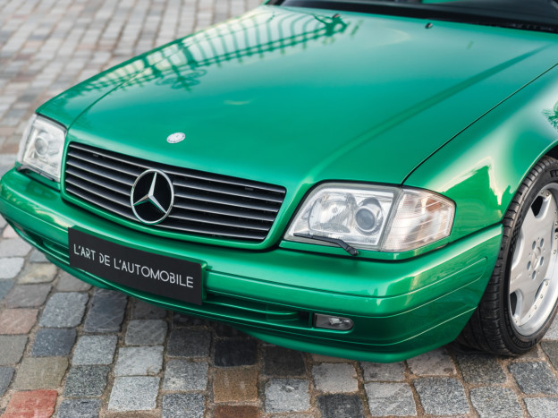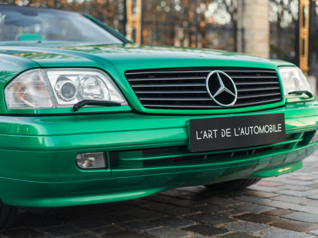 We are offering for sale an exceptional example of the legendary Mercedes SL 500 R129. Delivered new in Sweden, this car has covered only 33,500 km over 28 years! It is a 2+2 version and naturally presents itself in an exceptional state of preservation. It benefits from a spectacular Designo spec: the exterior is finished in the extremely rare Edison Green Metallic shade, matched with numerous Designo green leather inserts in the interior. Its configuration was pushed to the finest details, featuring the sublime original 18" AMG wheels that required body shell modification, and inside, beyond the bespoke Designo carpets, one immediately notices the abundance of green-tinted carbon on the center console and door panels, enhancing and making this car truly unique.