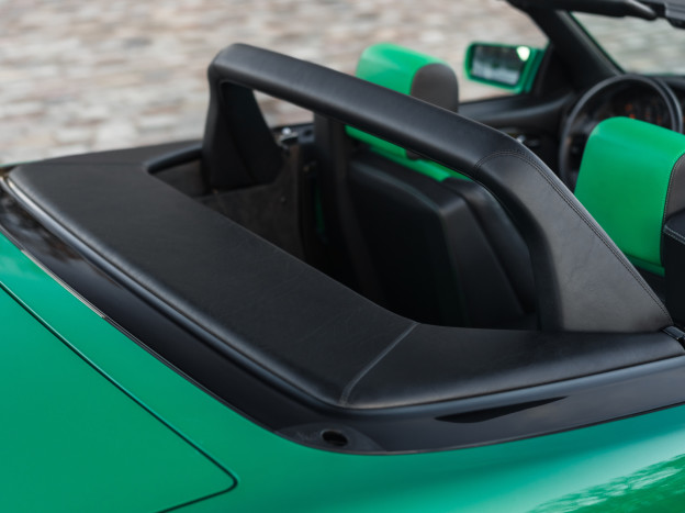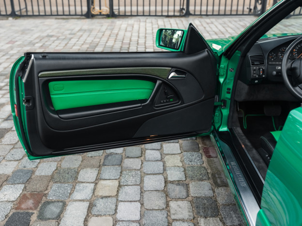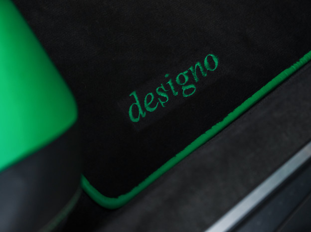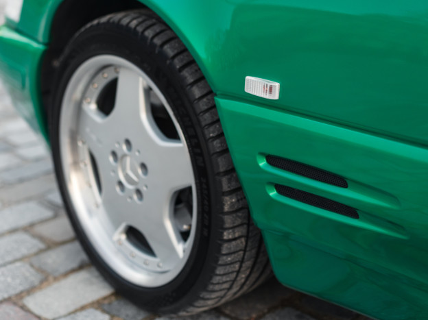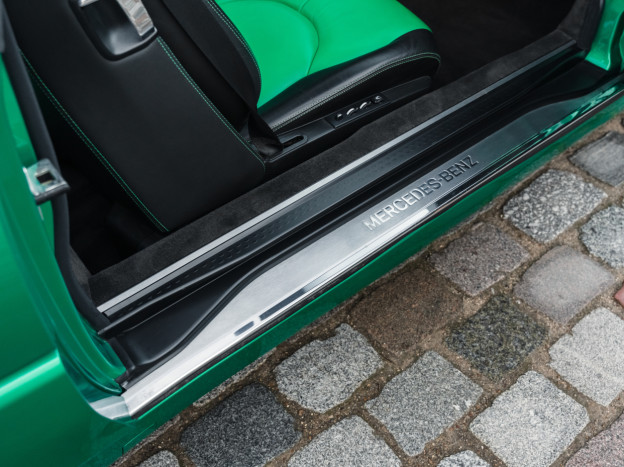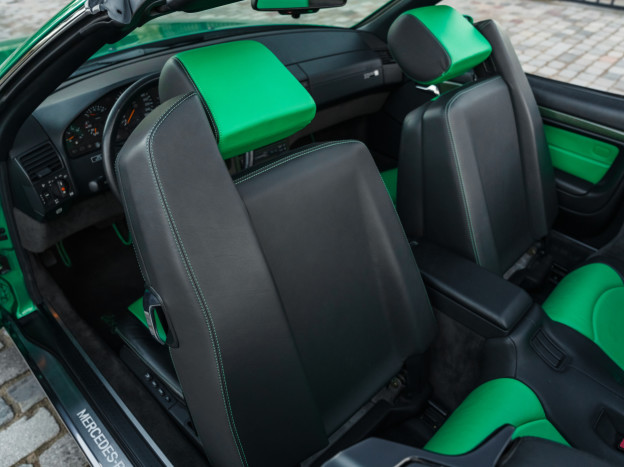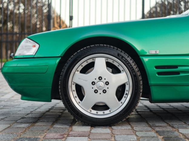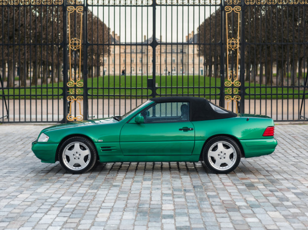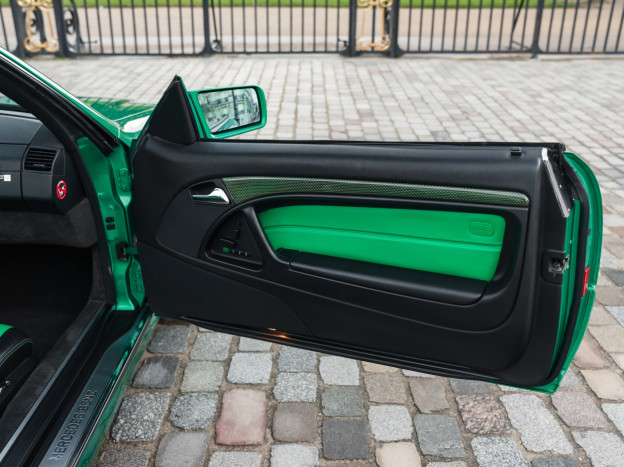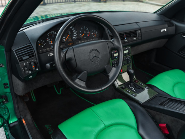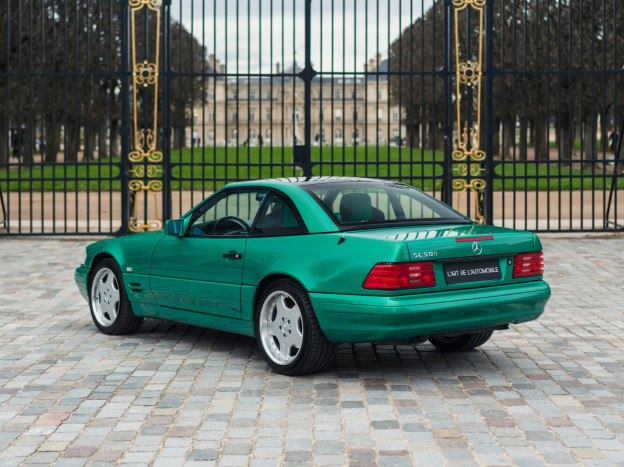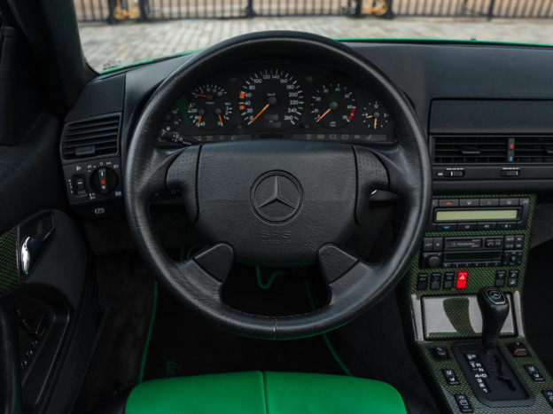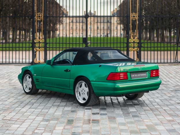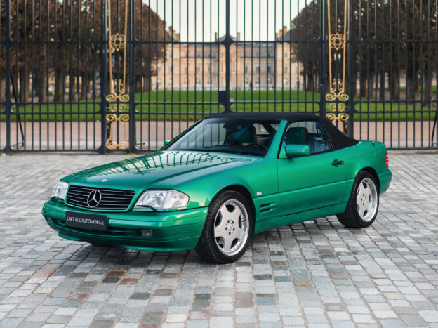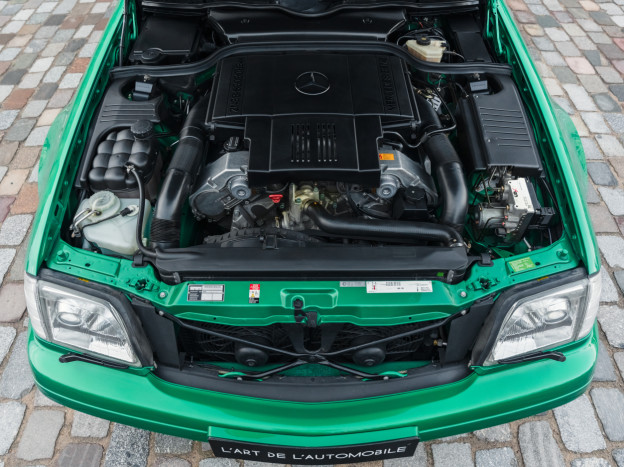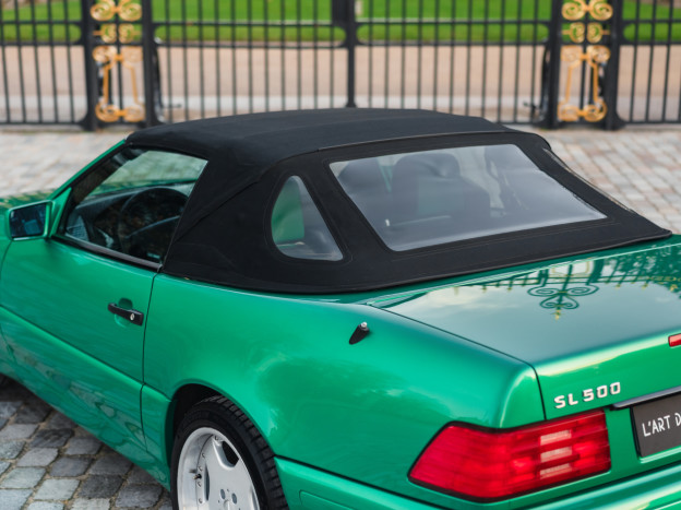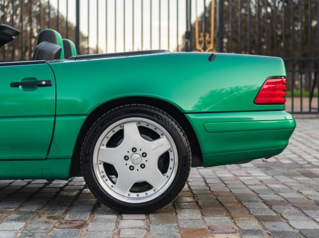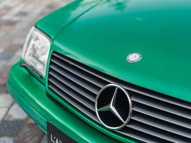 We are offering for sale an exceptional example of the legendary Mercedes SL 500 R129. Delivered new in Sweden, this car has covered only 33,500 km over 28 years! It is a 2+2 version and naturally presents itself in an exceptional state of preservation. It benefits from a spectacular Designo spec: the exterior is finished in the extremely rare Edison Green Metallic shade, matched with numerous Designo green leather inserts in the interior. Its configuration was pushed to the finest details, featuring the sublime original 18" AMG wheels that required body shell modification, and inside, beyond the bespoke Designo carpets, one immediately notices the abundance of green-tinted carbon on the center console and door panels, enhancing and making this car truly unique.