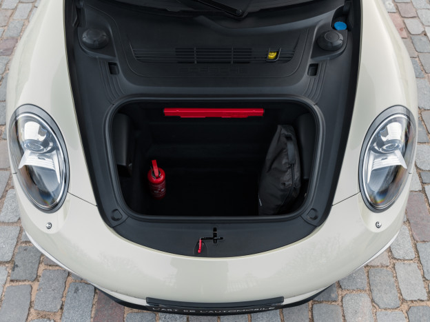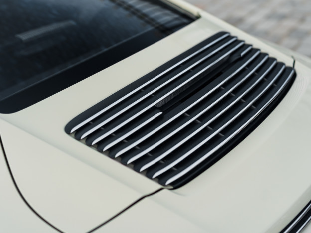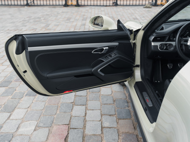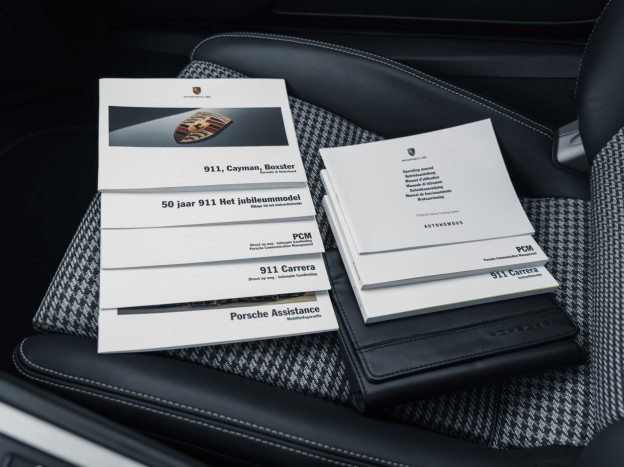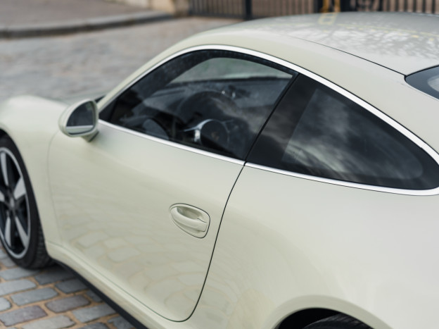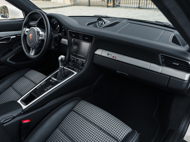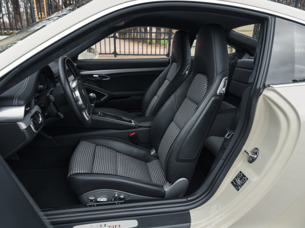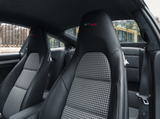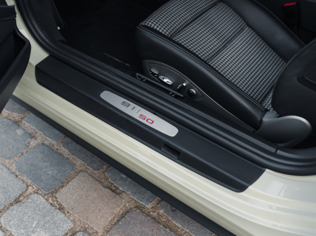 On retrouve sur cette déclinaison rarissime des baguettes chromées sur les prises d'air avant et les ailettes du capot moteur, et la double ligne chromée entre les feux arrière vient souligner ce modèle. Chaque exemplaire arbore un badge bicolore 911 50 sur le hayon arrière. Ce motif est repris en broderie tricolore sur les appuis-tête et en logo bicolore sur le compte-tours et les seuils de porte en aluminium. L'intérieur est également un bel hommage à la 911 d'origine : les instruments sont dotés d'un marquage vert, d'aiguilles blanches et de capuchons argentés, comme il y a 50 ans. Les inserts des sièges en cuir sont en tissu Pepita, comme à l'époque également.
