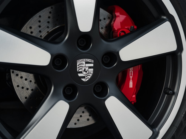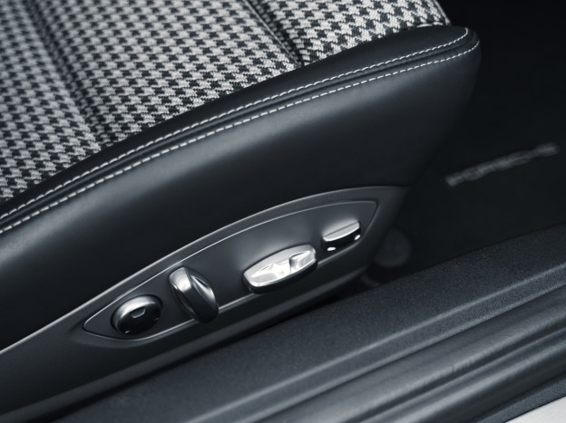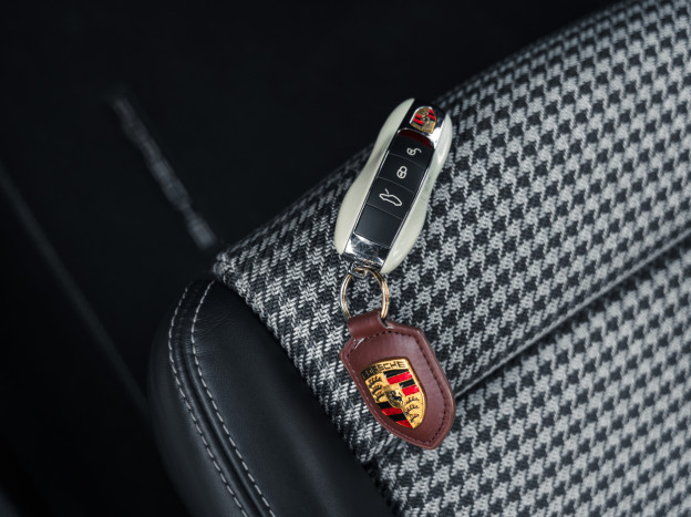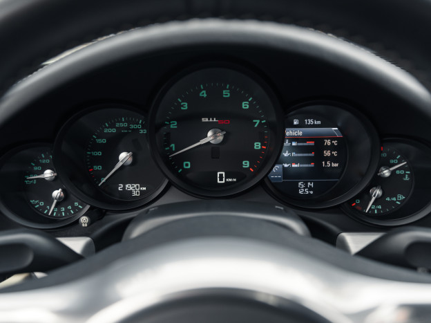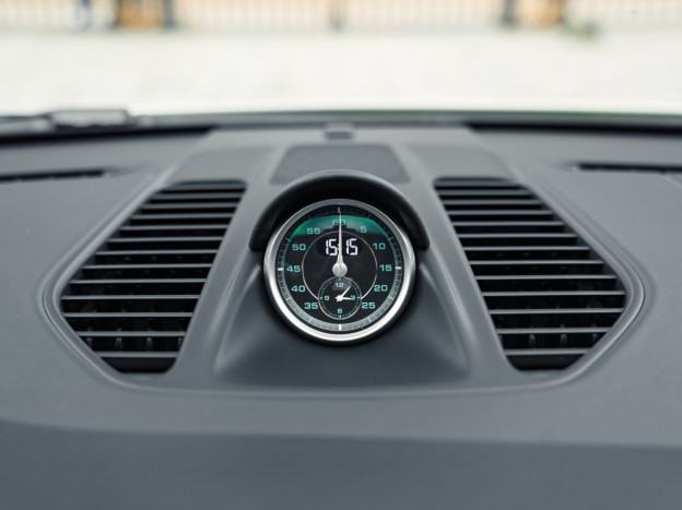 This extremely rare variant features chrome trim on the front air intakes and hood fins, and the double chrome strip between the taillights further emphasizes its distinctive character. Each example sports a two-tone 911 50 badge on the rear hatch. This motif is repeated in tricolore embroidery on the headrests and as a two-tone logo on the tachometer and aluminum door sills. The interior is also a beautiful tribute to the original 911: the instruments feature green markings, white needles, and silver caps, just as they did 50 years ago. The leather seat inserts are made in Pepita fabric, just like back then.