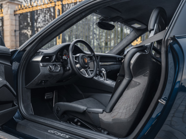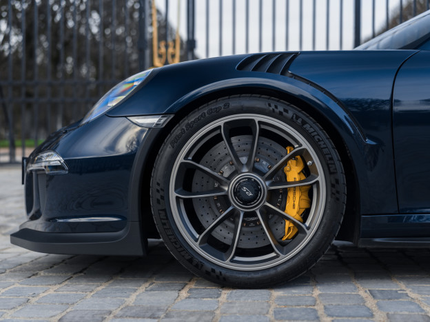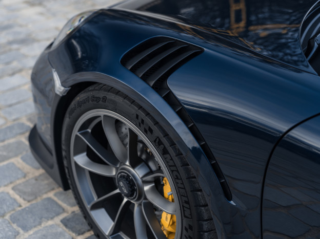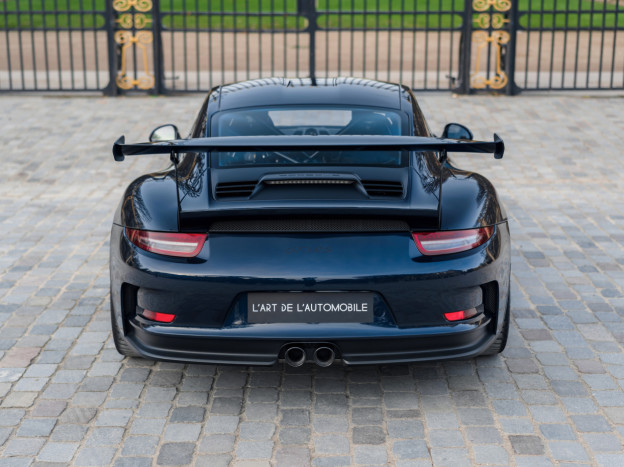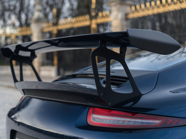 The Porsche 991 GT3 RS is seen as the most extreme production model in the 911 range. For this reason, this ultra-radical car is fitted as standard with a huge fixed rear spoiler, center-nut wheels, additional air outlets, as well as a fire extinguisher and 6-point harnesses inside the imposing roll cage. To earn the prestigious RS label, this 991 obviously benefits from increased displacement, lighter weight, optimized aerodynamics and running gear.