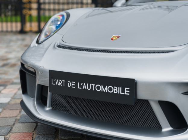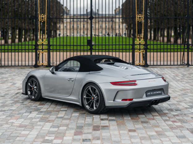Véritable collector et l'une des plus belles réalisations de Porsche de ces dernières années, nous sommes heureux de proposer à la vente une Porsche 991 Speedster en état irréprochable, encore en première peinture, qui a parcouru seulement 7 500 kms. Deuxième main française livrée par le Centre Porsche Clermont-Ferrand en septembre 2019, elle bénéficie du Pack Heritage Design et donc de la peinture Argent GT, avec la suppression des décorations du Pack et les jantes en Platine, et un intérieur tout en cuir bicolore Cognac et Noir, avec les inserts de l'intérieur peints en Argent et les seuils de porte en carbone ainsi que les freins céramique.